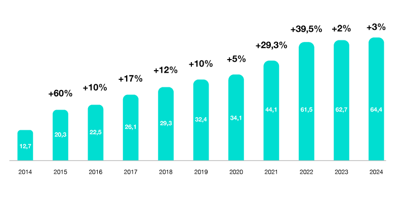 | Turnover | 22,5 | 26,1 | 29,3 | 32,4 | 34,1 | 44,1 | 61,5 | 62,7 | 64.4 | 2,6% |